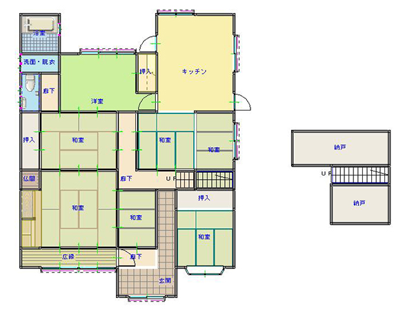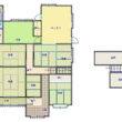 | 間取り | 7DK 1階:和8 和6 和4.5 和4.5 和3 和3 洋6.5 キッチン 風呂 トイレ 納戸 |
